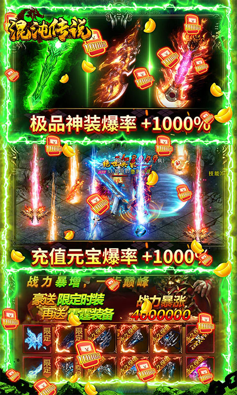 《混沌传说-送百万真充》是一款全新的传奇动作手游,打boss爆充值卡能激活每天累充和福利累计充值!开局免费送VIP15、百万元宝、金币*100000万,无限福利每日壕领不停!创角直升百级,日送百万元宝!BOSS爆率全部上调1000%,所有装备材料皆能爆!所有绝版酷炫时装免费抽,千倍返利嗨翻天!快邀请兄弟齐聚沙城,称霸全服!