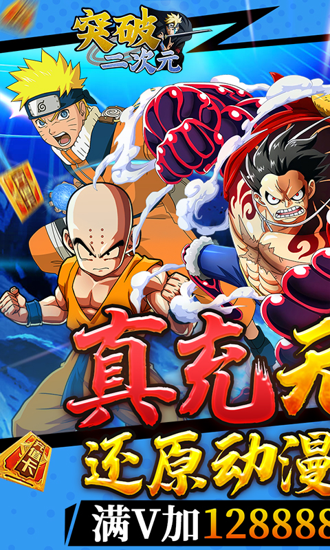 《突破二次元-无限送真充》众多大IP经典冒险卡牌手游,是你从未玩过的冒险卡牌游戏!上线既送VIP15, 赠送128888钻石,500万金币,288体力!你将会在里面收集到许多动漫中的人物形象,不同时空的角色齐聚一堂,组建强大的队伍,并肩战斗。无论你是想成为比博燃的火影,还是想成为海贼王的男人,或是成为无敌的超级赛亚人,亦或是唯我独尊的精灵王,都能在这里实现,快来实现你心中的梦想吧!